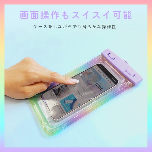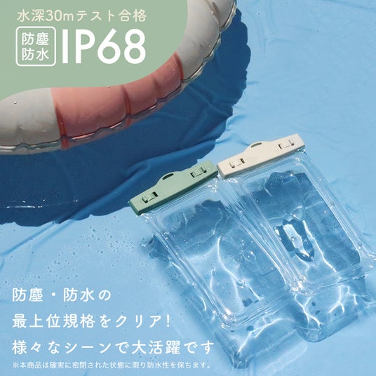 本製品は、この暑い夏を楽しんでいただきたいという気持ちからデザインだけでなく、価格にもこだわったスマートフォン用防水ケースです。スマートフォンを防水ケースに入れたままでもクリアな写真撮影が可能です。国際防水規格「IP68」を取得し、「継続的に水没しても内部に浸水することが無い(水中形)」という基準を満たす、心強い防水ケースです。フェスやキャンプ、プールでのレジャー使用や、雨の日やバスタイムでの普段使い、さまざまなシチュエーションでお使いいただけます。