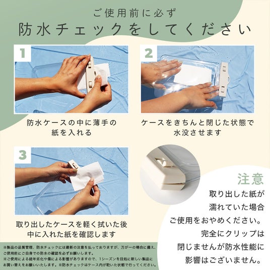 ※製品の品質管理、防水チェックは細心の注意をはらっておりますが、万が一の場合に備え、 ご使用前に毎回ご自身での防水の確認をお願いします。