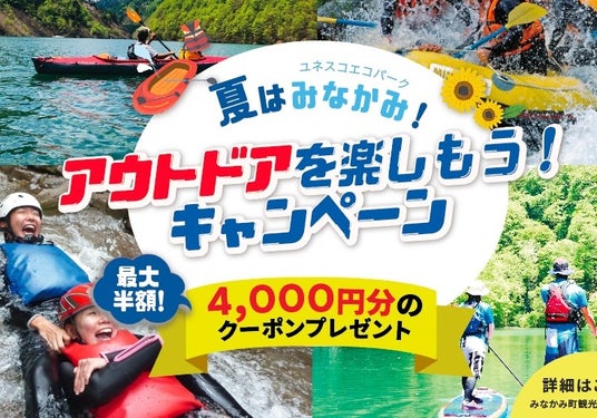 対象のアウトドア会社で8,000円以上のツアーに参加すると4,000円相当のクーポンをプレゼント! 最大半額のクーポンが付いてお得です!この夏は、群馬県みなかみ町で楽しい思い出を作ろう!