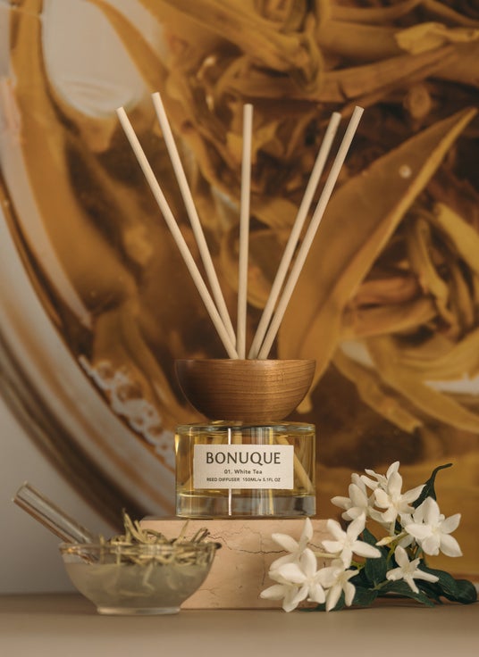 − ホワイトティーの上品な茶葉にウッドやバニラの甘みをほんのり感じる。ムスクで深みと豊かさを加え、心を落ち着かせる穏やかな香りに。