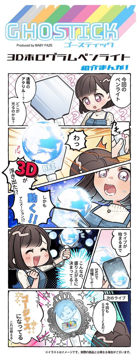 株式会社ベビーフェイズが3Dホログラムペンライト『GHOSTICK(ゴースティック)』を発表!普段は透明のアクリルプレートが、グリップのスイッチオンで3Dのホログラムが浮かび上がる!アーティスト写真なども3Dで浮かび上がるので、推しのメンバーやキャラクターといつでも会えるまさに未来の推し活ペンライトです!