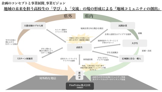 この事業の目的は、高校生の「学びたい」を応援しながら、人づくり・地域づくりを進めることです。「学びの広場」を核とし、市内の高校生に学習スペースを提供し、民間企業や大学、一般市民との繋がりを通じて新たな価値を生み出し、地域活性化を目指します。