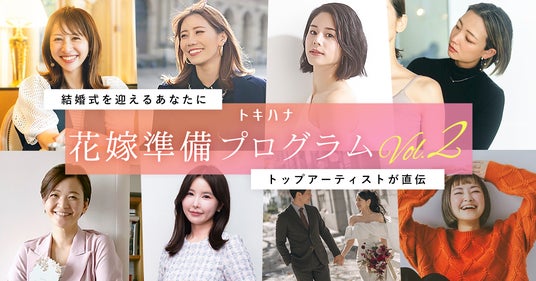 LINEでできる式場探し『トキハナ(https://tokihana.net/)』を運営する株式会社トキハナ(本社:東京都港区、代表取締役社長:安藤 正樹、以下「トキハナ」は、ウエディングの各界を代表するトップアーティスト7名とコラボレーションし、花嫁の結婚式準備をサポートする「花嫁準備プログラムvol.2」を開催します。