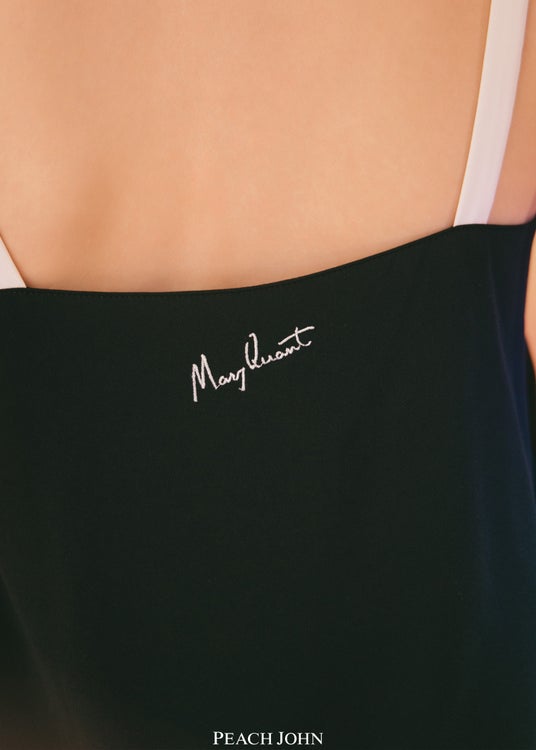 レトロヴィンテージ感あふれるミニ丈のスリップワンピ。デイジーの刺しゅうをあしらったネックラインは、谷間が見えづらいデザイン。背面には“MARY QUANT”のオリジナル刺しゅう入りです。