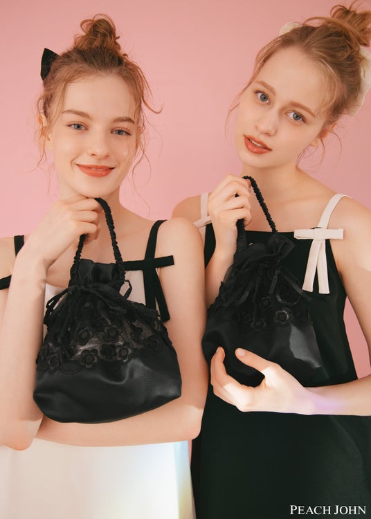 透け感のあるデイジーモチーフのレースとサテンを使用した、トレンド感のある巾着型ランジェリーポーチ。