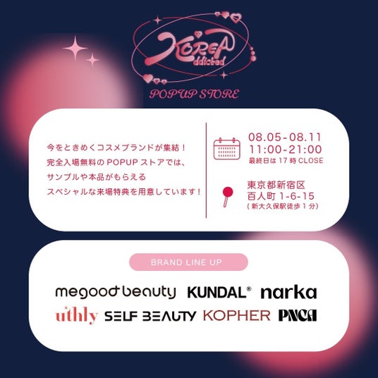 株式会社ダイヤコーポレーション(所在地:東京都新宿区 代表取締役:高野祐一)は、2024年8月5日(月)~8月11日(日)の期間で韓国情報メディア『KOREAddicted(コリアディクティッド)』が新大久保でPOPUPストアを開催することをお知らせします。