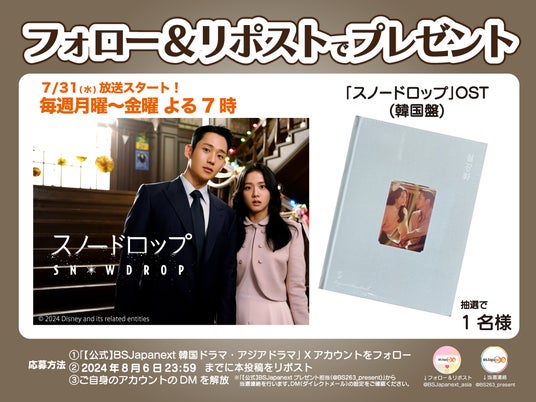 BSJapanextの韓国ドラマ・アジアドラマ公式X(旧Twitter)にて、放送を記念したプレゼント企画を開催!フォロー&リポストをしていただいた方の中から、抽選で「スノードロップ韓国版OST(オリジナルサウンドトラック)」を1名様にプレゼント! 詳細は「BSJapanext韓国ドラマ・アジアドラマ公式X」にてご確認ください。