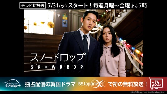 BS放送局『BSJapanext(読み:ビーエスジャパネクスト)』(BS263ch)にて、ディズニープラス独占配信の韓国ドラマ3作品が全話無料で放送!第1弾となるBLACKPINKジス主演ドラマ「スノードロップ」は7月31日(水)より、毎週月曜~金曜よる7時に放送!ディズニープラスの配信以外で放送するのは初!BSJapanextの韓国ドラマ・アジアドラマ公式X(旧Twitter)では、ドラマOSTのプレゼント企画も。ぜひBSJapanextにてテレビ初放送をお楽しみください。