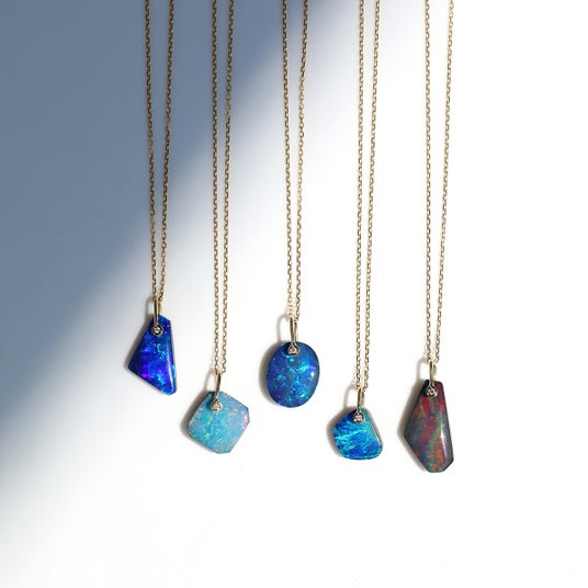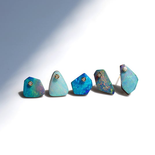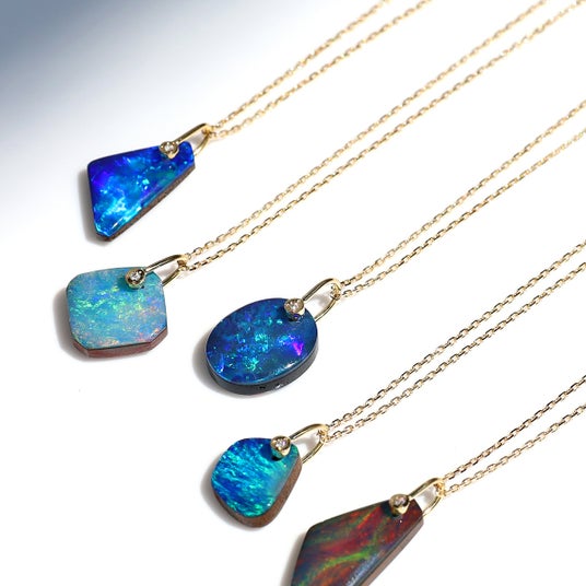 プレイオブカラー、遊色効果と呼ばれる、シャボン玉に浮かぶ虹状の光沢を思わせる光彩変化で知られるオパールですが、プレイオブカラーもベースカラーもすべてが異なる、まさに天然石ならでは、そしてオパールならではの魅力にあふれる、すべて1点物のジュエリーです。