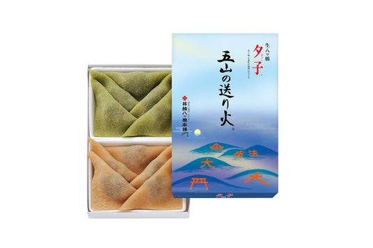 生八ッ橋夕子シリーズの中でも不動の人気を誇るニッキと宇治抹茶の味を詰め合わせ、夏の夜空を煌めく美しい炎が彩る五山の送り火パッケージに仕上げました。