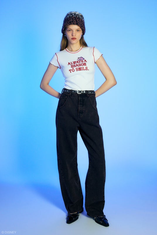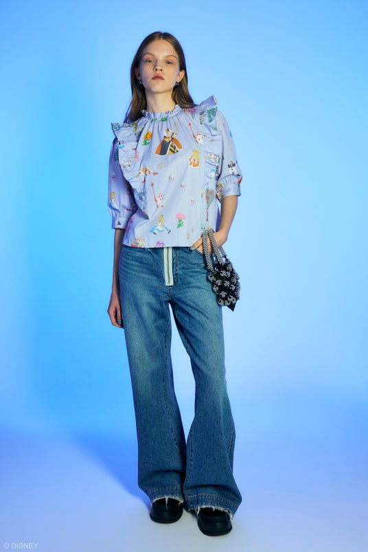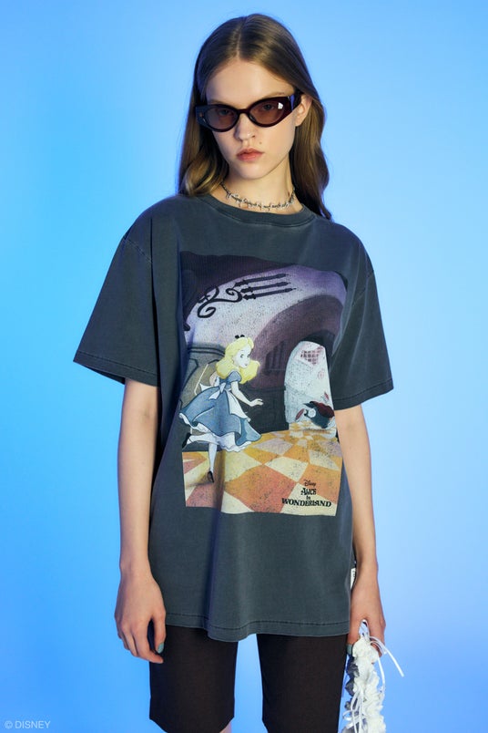 キャラクターが散りばめられた総柄フリルブラウスや、貴重なアーカイブより選定したアートを全面プリントしたシアートップス、白うさぎを追いかけているアリスとの印象的なシーンと明るい性格の双子の兄弟Tweedledee and Tweedledum(トゥイ―ドル・ディーとトゥイ―ドル・ダム)と踊っているアートをヴィンテージテイストに表現したユニセックスサイズのオーバーサイズTシャツ、チシャ猫と配色ステッチを効かせたコンパクトなTシャツなど、古着屋から掘り出してきた様なレトロ感のあるラインナップ。