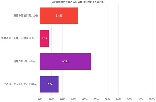 また、海苔商品を購入しない理由も調査すると、「調理方法がわからない」との回答が最も多かったです。
