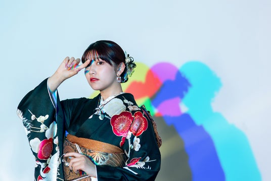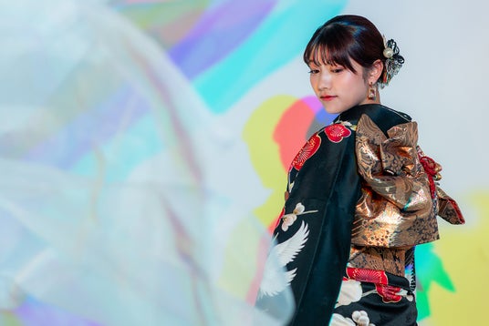 攻めた映像演出ながら、雅やかな雰囲気と年代特有のかわいらしさを表現するため2種類の振袖コーディネートを用意し、トータルバランスを保つ。