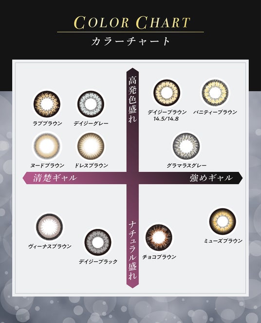 全12種類で、DIAは14.8mmと14.5mmの2サイズ展開と盛れ度が選べ、強めギャルから清楚ギャルまでどんなギャルにも合わすことのできるカラーラインナップです。