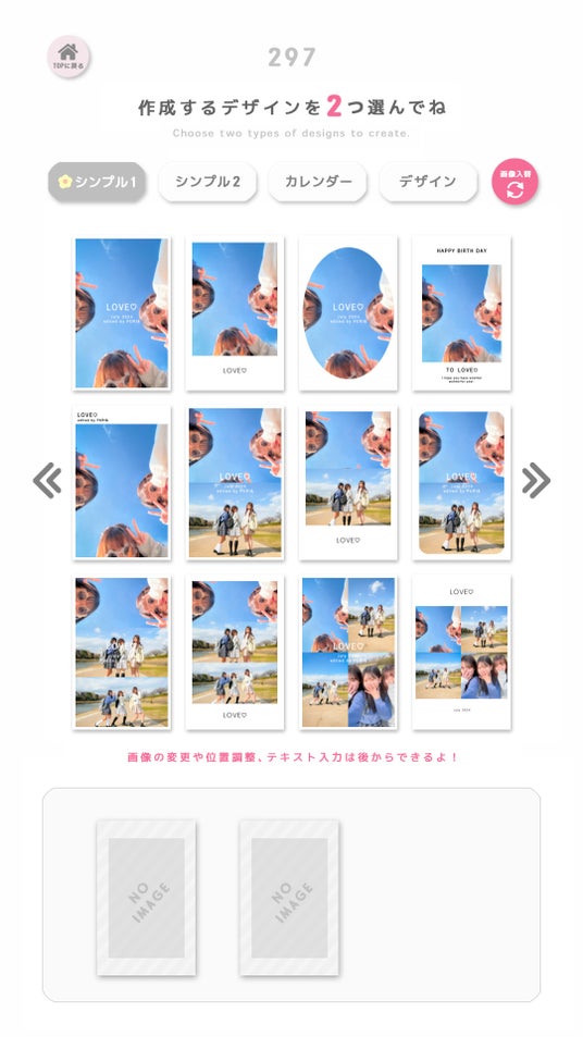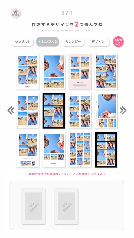 デザイン全48種類からお好きな2種類を選択し写真をレイアウトの上、印刷。