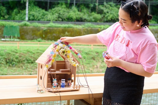吉野杉でできたドールハウスをお花でアレンジした唯一無二の木の家です。