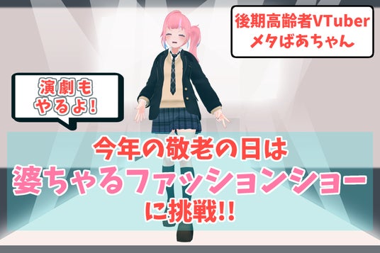 OTAGROUP株式会社(本社:広島県広島市南区、代表取締役:下西 竜二)は、後期高齢者VTuber「メタばあちゃん」が2024年9月16日(祝)に自身のYouTubeチャンネルにて「メタばあちゃん婆ちゃるファッションショー~若い頃にできんかったことをやってみます~」を開催することをお知らせいたします。