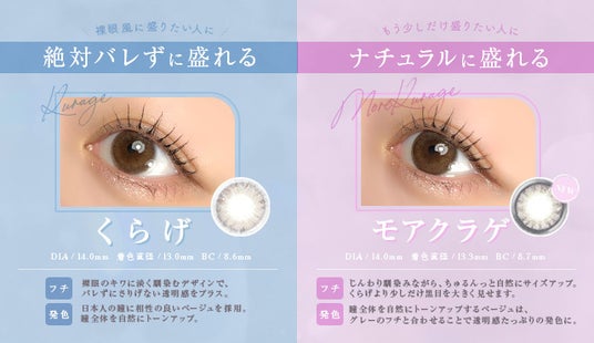 現在販売中の人気No.1カラー※「くらげ」のナチュラルさと透明感はそのままに、”もう少しだけ黒目を大きく魅せたい…”を叶えるべく、ちゅるっと可愛い馴染みのよいグレーのフチを追加した新デザインです。