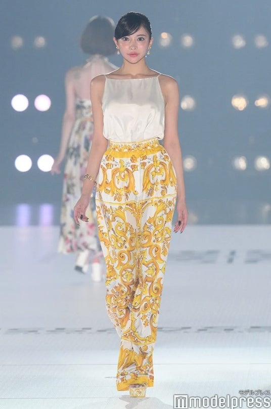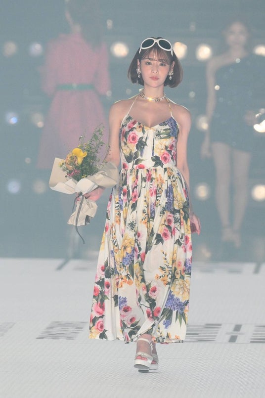 天海りこは夏にぴったりな、南国を感じさせるワンピにサングラスをOn。花束を持ってランウェイを彩った。