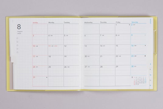 各月の月間ページの後ろに横罫と方眼のメモページが2ページずつ付いたスクエア型のマンスリー手帳。