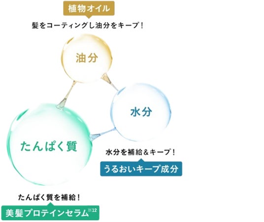 ※1 自社シリーズ比較 ※2 一部取り扱いのない店舗もございます ※3 予告なく取り扱いを終了する可能性があります ※4 一般的に美しいといわれる毛髪内部の比率構成 ※5 ダイヤモンド末、加水分解シルク、イソステアロイル加水分解シルク[全商品共通]、塩化ヒドロキシプロピルトリモ二ウムデンプン[トリートメント、ヘアオイルのみ](全て保湿成分) ※6 ジラウロイルグルタミン酸リシンNa(毛髪補修成分) ※7 ポリクオタ二ウム-92(毛髪補修成分) ※8 ラウロイルグルタミン酸ジ(フィトステリル/オクチルドデシル)[シャンプー、トリートメント、ヘアミルクのみ](毛髪補修成分) ※9 ダイヤモンド末(保湿成分) ※10 加水分解シルク、イソステアロイル加水分解シルク[全商品共通]、塩化ヒドロキシプロピルトリモ二ウムデンプン[トリートメント、ヘアオイルのみ](全て保湿成分) ※11 シャンプー:マイナスにイオン化した成分(加水分解ヒアルロン酸)を配合、トリートメント:プラスにイオン化した成分(ポリクオタ二ウム-64)を配合 ※12 アルギニン、アスパラギン酸、グリシン、アラニン、セリン、バリン、イソロイシン、トレオニン、プロリン、ヒスチジン、フェニルアラニン(ここまで全て保湿成分)、加水分解エンドウタンパク、加水分解ローヤルゼリータンパク、加水分解コメタンパク、加水分解ダイズタンパク(ここまで全て毛髪補修成分)