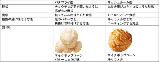 ポップコーンの原料となるトウモロコシ「爆裂種」には、「バタフライ型」「マッシュルーム型」の2種類があり、使用するトウモロコシの種類によってはじけ方が異なり、形状が変化します。当社では、フレーバーごとに相性の良い種類を採用しており、定番フレーバーであるソルト系の「バターしょうゆ味」は、“ふわっ!サクッ”とした軽い食感を楽しめるバタフライ型を採用しています。今回の新フレーバーは、しっかりとした食感とキャラメルなどの均一なコーティングがしやすいマッシュルーム型を使用しており、“パリッサクッ”食感を実現しています。
