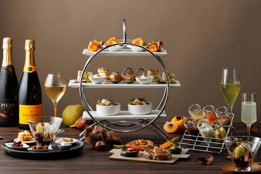 秋のハイティーは、セイボリーやデザートを葡萄や梨、栗など7種以上のフルーツで華やかに彩り、料理に合わせるソースやデザートのトッピングをゲストが自由にプチアレンジできる楽しさを盛り込みました。スタンド上段、中段に配した前菜は、鴨のローストやフォアグラテリーヌなど6種をご用意。別添えの秋のフルーツソース6種は、シェフのおすすめの味わいで楽しむのはもちろん、様々な組み合わせを試して自分だけのオリジナルの味わいを探求するのも魅力。下段の魚料理は、魚介の旨みが凝縮されたアクアパッツァに、葡萄とみかんの爽やかさをプラスし、フルーツの華やかな香りが魚介の濃厚な味わいを引き立てます。メインディッシュの国産牛フィレ肉のグリルは、林檎の甘酸っぱさが肉の旨味と合わさり絶妙なハーモニーをお届け。デザートには、お好みのトッピングで自分だけのオリジナルパフェを自由に作りお楽しみいただけます。フリーフローのドリンクには、シャンパン ヴーヴ・クリコの他、オリジナルカクテルや紅茶をご提供いたします。