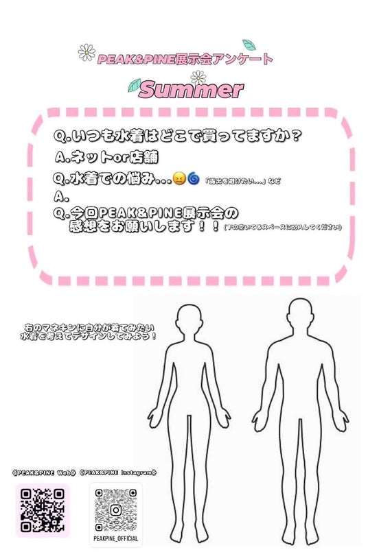 PEAK&PINEさんとの合同展示会で多くを学びました。マネキン(全身人形)とトルソー(胴体部分のみ)の違いも、この展示会で初めて知りました。告知画像を作る際に、正式なロゴマークを使用することや、展示する水着の数を配置図に基づいて決めることの重要性を学びました。
