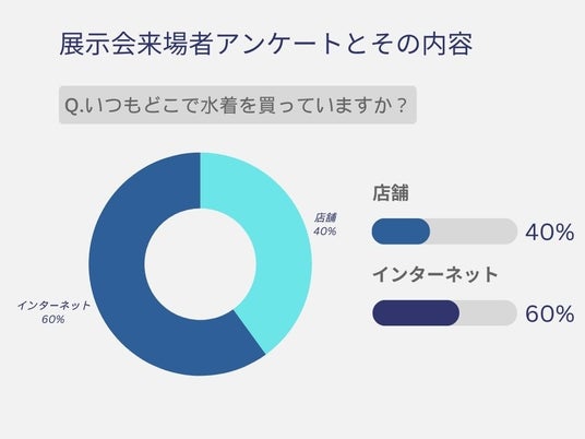 コラボレーション展示会当日は、計30名の方に来場いただきました。展示会場では、来場者の購買行動やニーズに関するアンケートを配布し、計18名から回答を得られました。アンケート調査の結果、インターネットで水着を購入していると回答した人は60%、店舗で購入していると回答した人は40%でした。また、水着に関する悩みについても調査したところ、回答者の半数以上が「肌の露出が多いことに抵抗がある」と答え、他にも「体の悩みをカバーする水着が欲しい」という声も目立ちました。今回の調査結果は、今後の商品開発や販促に役立つ参考情報として、「PEAK&PINE」に報告書を提出しました。