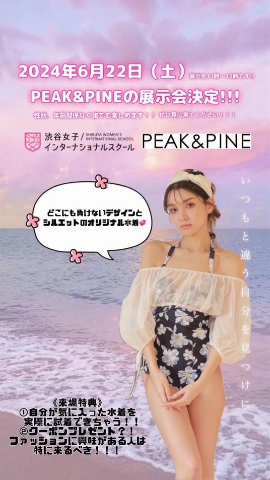 英会話や動画制作などを学びながら高卒資格が取得できる渋谷女子インターナショナルスクール(校長:赤荻 瞳)は、株式会社ミューラーン(所在地:東京都中央区 代表取締役社長:三浦 誠巳)が運営する人気水着ブランド「PEAK&PINE」(ピークアンドパイン/ORIGINAL BRAND)とのコラボレーション展示会を、東急プラザ表参道「オモカド」内にある、渋谷女子インターナショナルスクールの教室で2024年6月22日(土)に開催しました。この展示会は、渋谷女子インターナショナルスクールが企画した、学生と企業による共同プロジェクトです。学生たちが主体的に企画・運営に関わる、実践形式の授業の一環として実現しました。