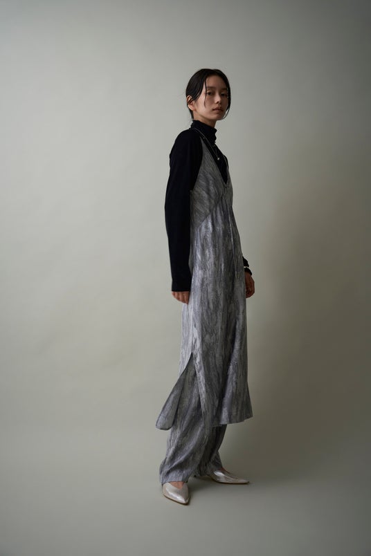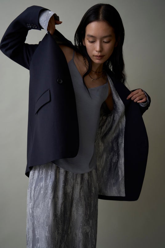 Namika Nakaiのファインアート作品からインスピレーションを受け作成したオリジナルジャガード素材を使用。艶やかで程よい落ち感のあるジャガード素材は、桐生で織り上げた世界で一つだけの特別な素材です。(ジャケット・ワンピース共に同素材)