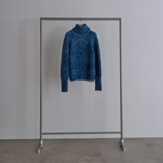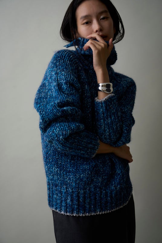 特徴的な繊細な色の重なりを、イタリア糸の持つ発色の良さを活かしたメランジのウールの糸で表現。ゆったりとしたシルエットでコンフォートに過ごせます。袖口と裾にはシルバーのラインをオン。
