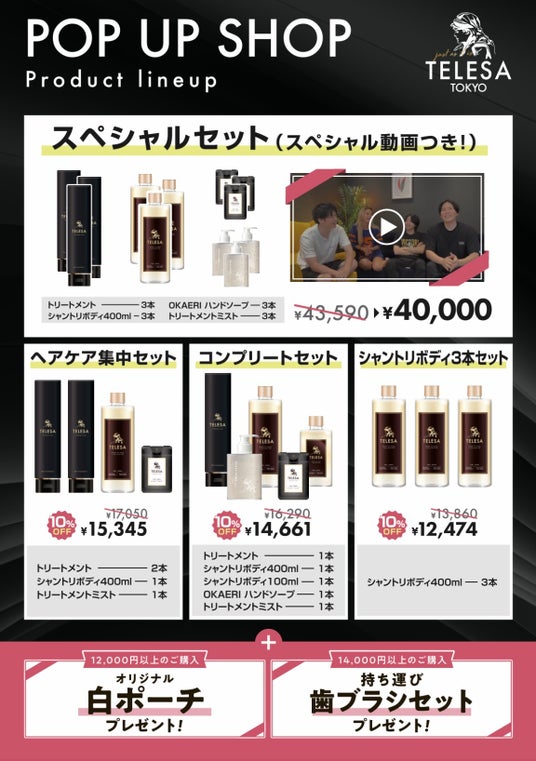 時代を先駆けるヘア&ボディケア美容ブランドTELESA TOKYO(所在地:東京都品川区、代表取締役:車谷セナ)は、日頃よりご愛顧頂いているお客様、そしてNontitleSeason4をきっかけに新しくTELESAを知って頂いたお客様へポップアップショップを通して感謝の気持ちを届けようと、「TELESA感謝祭」を、9月11日(水)から9月17日(火)の期間限定で開催致します。