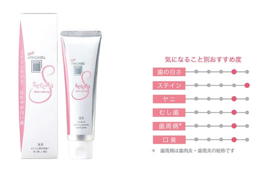 「アパガードセレナ」は昨年春の発売から、前年比114%と好調な売り上げを推移しており、商品の満足度や泡立ちのよい使用感に多くの支持を集めています。 「毎日紅茶を飲んでいるから、手軽にステインケアできるところがお気に入り。」 「ジャスミンミントのフレーバーもフルーティーで好み。」「ちゃんと泡立つ。香りもさっぱり。」などと嬉しい声が届いています。