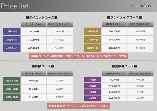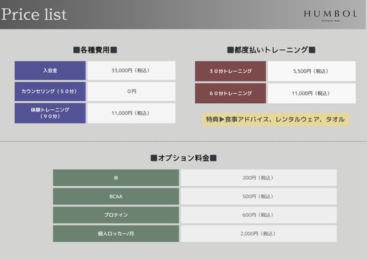 パーソナルジム HUMBOL市原五井店の料金表2.