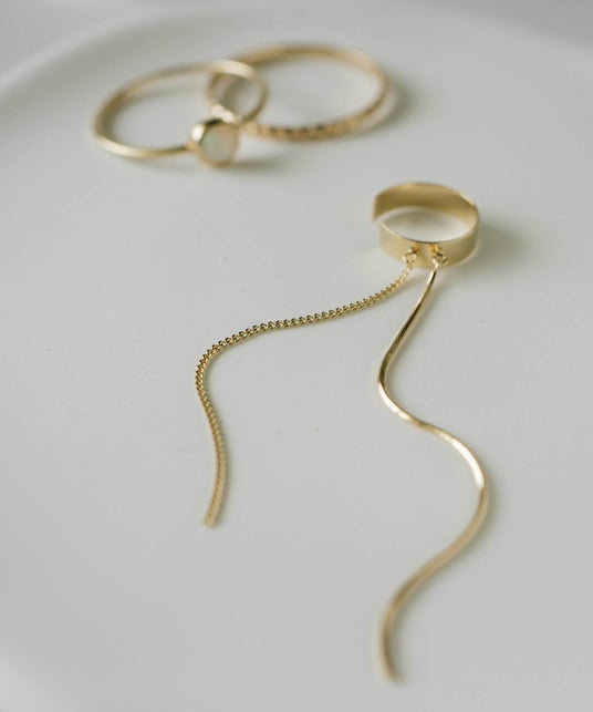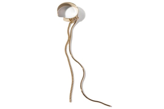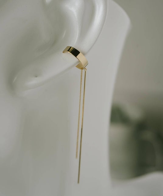 シンプルでありながらも、目を引くデザインのK10ゴールドフープイヤーカフ。優雅なフープには、2種類の異なるチェーンがしなやかに揺れ、耳元に洗練された表情を添えます。繊細なゴールドの輝きが、上品な印象を与え、どんなスタイルにも美しく調和します。