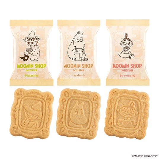 コク豊かでミルキーなホワイトソイショコラに森の実りを練り込みました。ムーミン柄はクルミ味、リトルミイ柄はストロベリー味、スナフキン柄はピスタチオ味。ムーミンたちがかわいい、サクサクおいしい分厚いサンドです。