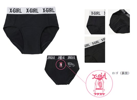 X-girl × 福助× KAORUKO との3社でコラボレーションした吸水ショーツ。女性活躍社会を提唱するWEリーグ、女子プロサッカー選手の声を基に、生理周期でも安心して着用できるように、本来寝ている状態を前提としていた「夜用」の機能を活かし、アクティブに動ける「昼用」の仕様を持ち合わせたハイブリットモデルになります。また、ネガティブに捉われがちなフェムテックウェアをポジティブに着用頂きたいとする思いから「魅せる吸収ショーツ」としてデザインをしております。
