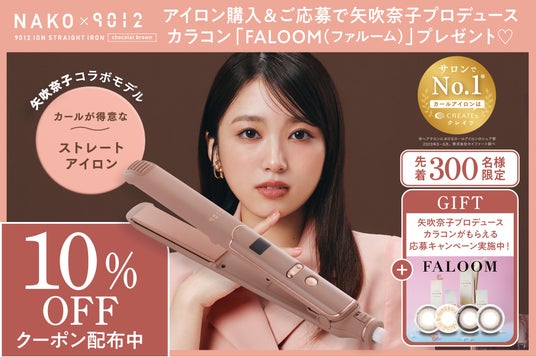 さらに、矢吹奈子さんプロデュースアイテム「NAKO×9012 イオンストレートアイロン ショコラブラウン」を対象店舗(ホリスティックキュアーズ公式オンラインショップ、クレイツ公式楽天市場店、クレイツ公式Qoo10店)でご購入いただいたお客様に限り、先着300名様へFALOOM現品をプレゼントいたします。また、対象店舗ではインスタライブ開催記念の10%OFFクーポンも配布!