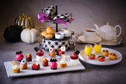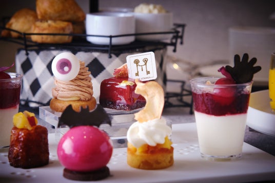 スイーツは、お化けモチーフが可愛らしいカシス香るモンブランや、ザクロとブドウのジュレ、酸味を効かせたカシスのムース、また、繊細なりんごのキャラメリゼを飾ったさつま芋のケーキ、艶やかなラズベリー色の濃厚ショコラムース、芋の甘露煮を飾ったしっとりしたカヌレなど秋の味覚を使用した計6種をご用意。特製セイボリーは、くちどけ滑らかなかぼちゃのムース、トリュフときのこのライスコロッケ、秋の味覚の栗を使用した一口キッシュの3種をご堪能いただけます。