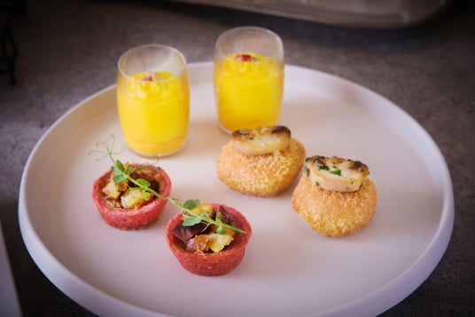 2種を、焼きたてでお席までお届けいたします。コンディメントは塩味を効かせたクロテッドクリーム、果肉が入った無花果のジャム、はちみつの3種類をご用意。外はサクッと、中はしっとりしつつも軽い食感のスコーンとあわせてお召し上がりいただけます。