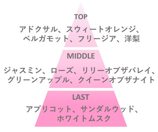 フレッシュなオレンジやベルガモット、甘い洋梨などがアドクサルの引き締まった香りで気分を高揚させるトップノートとなっています。そして優しい甘さのフルーツや花々が重なり、“夜の女王”の名を持つ月下美人の濃厚な香気に包み込まれセクシーな気分を演出するミドルノートへと続きます。ラストノートには落ち着いた甘さのアプリコット、サンダルウッド、ムスクが優しく残ります。