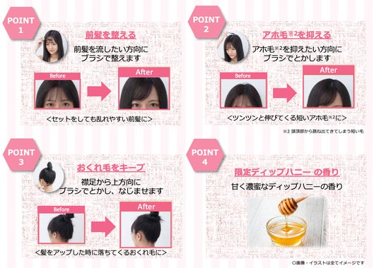 前髪・アホ毛※2・おくれ毛を抑えたい方向にブラシでとかしてなじませることで、簡単にスタイリングができます。甘く濃蜜なディップハニーの香りを採用しています。