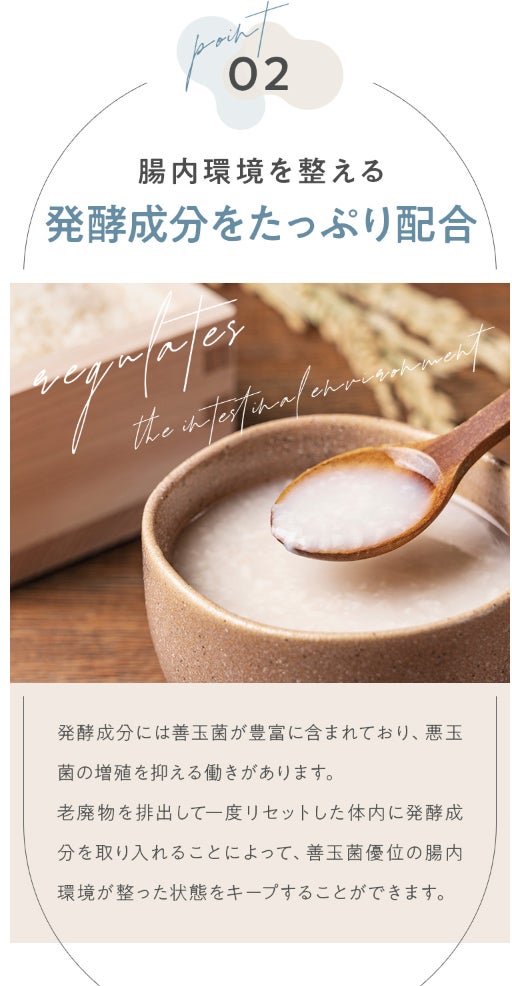 原材料:ポリデキストロース、還元麦芽糖水飴、サイリウムハスク末、米麹粉末、ヨーグルトパウダー、澱粉、コラーゲンペプチド、グルコマンナン、イソマルトオリゴ糖粉あめ、ラクチュロース、酵母、乳酸菌(殺菌)末、穀物麹(大麦、粟、稗、黍、高黍、紫黒米、米粉)、植物発酵エキス末、リンゴ抽出物、他