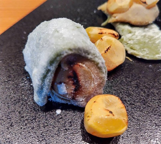 柔らかな求肥の中に、モンブランクリームと焼き栗を包んだ秋を彩る極上のスイーツです。