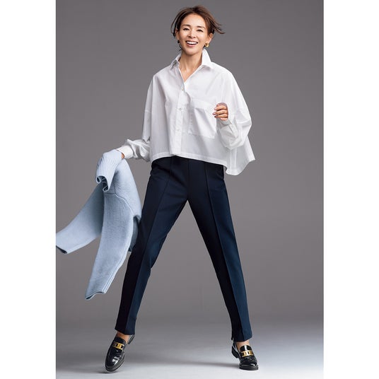 白とネイビー2色をセレクトしたパンツは、リッチな風合いと暖かな肌触りを備えた裏起毛ジャージー素材。ウエスト周りやわたり部分に程良くゆとりを持たせたテーパードラインで、前中央のピンタックがきちんと感と美脚効果を後押しします。裾内側にはファスナースリットを設け、ブーツインでももたつかない筒幅と脱ぎ着のしやすさにも拘りました。SHIHOさん曰く、「目指したのは、ホテルにもはいていけるリラックスパンツ(笑)。素材選びにも試作チェックにも時間をかけた自信作」です。