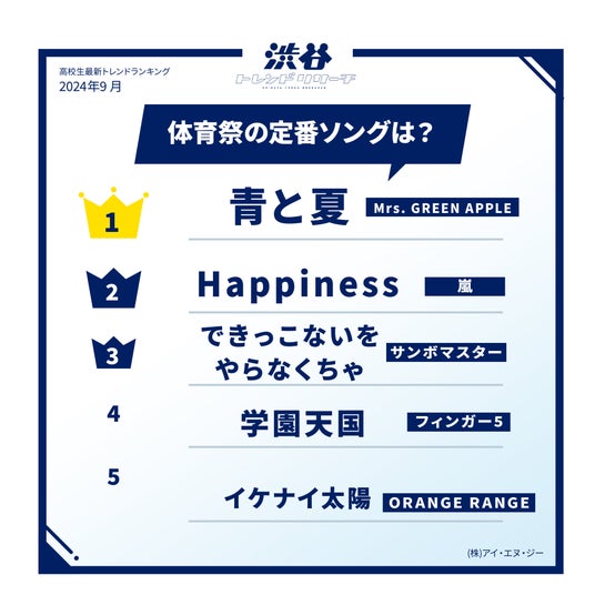 今回、「青と夏/Mrs. GREEN APPLE」が1位を獲得。爽快感あふれるアップテンポな楽曲は体育祭を盛り上げる曲として多くの学校で使用されているようです。2位は「Happiness/嵐」が入選。2007年にリリースされた曲ですが、体育祭の定番ソングとして令和の高校生にも定着しており、世代を超えて愛され続けています。3位に「できっこないを やらなくちゃ/サンボマスター」がランクイン。ドラマ『チア☆ダン』のイメージソングに起用され、“頑張る人たちへの応援歌”として体育祭の楽曲としても根付いているのではないでしょうか。
