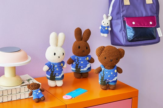 MoMA Exclusive:Dick Bruna(ディック・ブルーナ)のかわいい絵本に登場するミッフィーと仲間たちが編みぐるみになりました。なめらかなコットンをかぎ針編みしてキャラクターを模り、目の部分は刺繍で表現しています。MoMAコレクションに収蔵されているVincent van Gogh(フィンセント・ファン・ゴッホ) の代表作『The Starry Night』(星月夜)にインスパイアされたドレスを着ています。