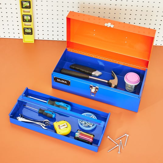 MoMA Exclusive:工具などを収納できるカラフルなツールボックスです。コネチカット州・ミドルタウンを拠点に家族3世代で経営する金属工場のBull Metal(ブル・メタル)が手掛けました。自社内で頑丈な22ゲージの冷延鋼板で作り、防サビパウダー加工を施しています。MoMA限定のデュアルカラー仕様です。持ち手と取り外し可能なトレイ付き。