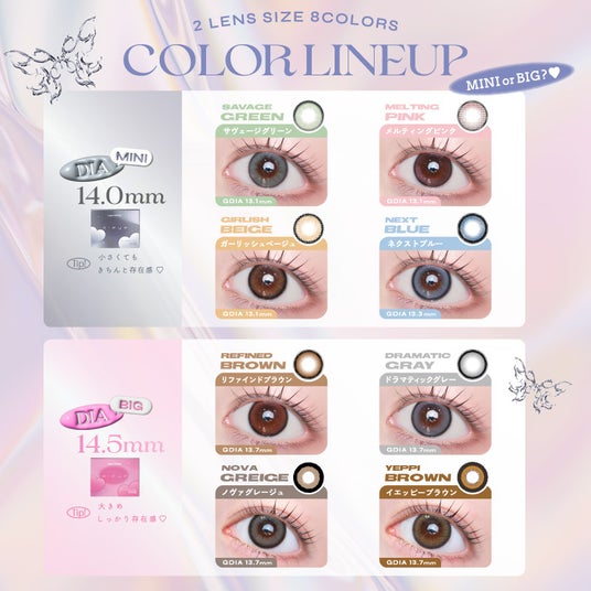 全色細フチ系デザインで、レンズ直径も小さめ(14.0mm)と大きめ(14.5mm)の2パターン展開となっており、絶妙に盛れて”理想の私を超える”カラーラインナップ!!